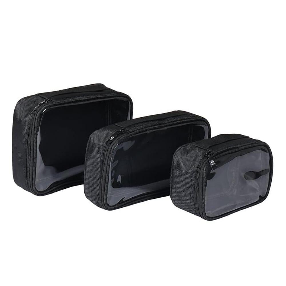 شنطة مكياج شفافة باللون الأسود بتصميم أنيق ومتين، تساعدك على تنظيم مستحضرات التجميل والأدوات اليومية بسهولة. تتميز بمساحة كافية لحفظ الفرش، كريمات الأساس، أحمر الشفاه، والعطور الصغيرة.