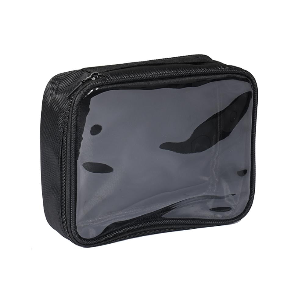 شنطة مكياج شفافة باللون الأسود بتصميم أنيق ومتين، تساعدك على تنظيم مستحضرات التجميل والأدوات اليومية بسهولة. تتميز بمساحة كافية لحفظ الفرش، كريمات الأساس، أحمر الشفاه، والعطور الصغيرة.
