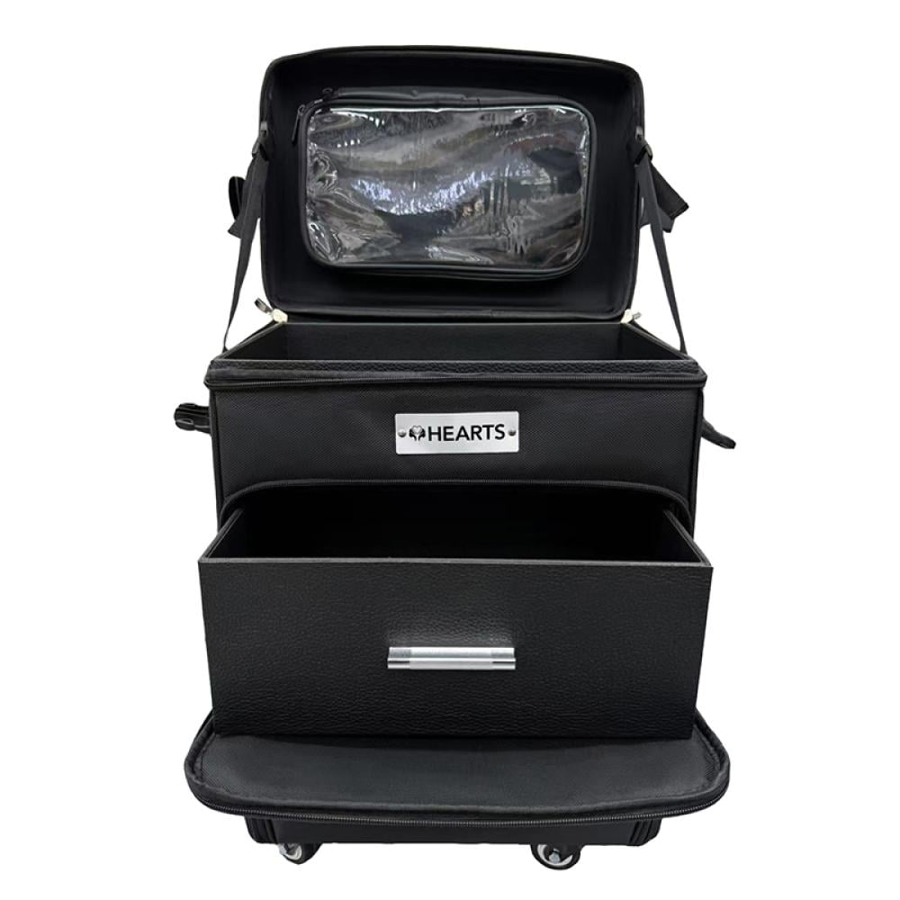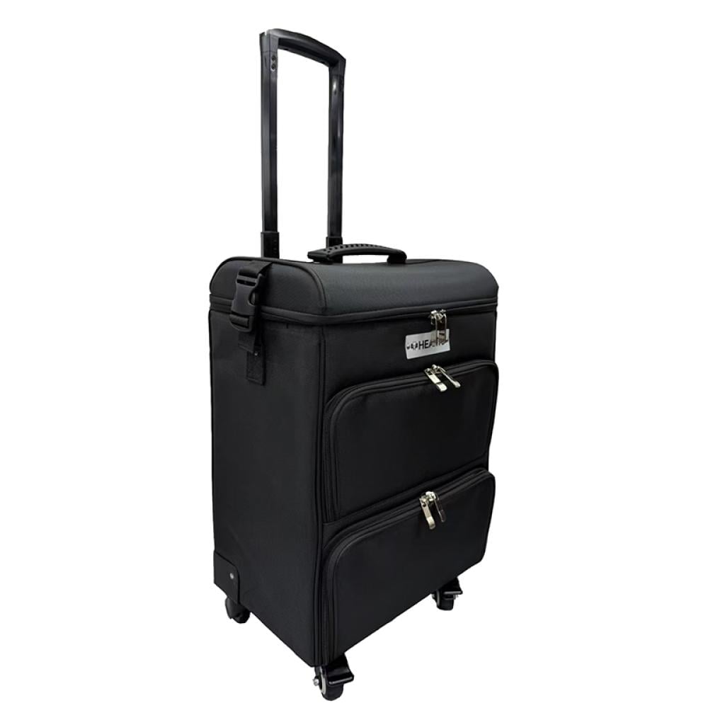 تتميز بتصميم فاخر باللون الأسود مع عجلات دوّارة تسهّل الحركة، ومقبض سحب تلسكوبي قوي لسهولة التنقل. تحتوي الشنطة على أدراج واسعة قابلة للسحب بالإضافة إلى تقسيمات علوية عملية لحفظ جميع أدوات المكياج مثل الفرش، كريمات الأساس، أحمر الشفاه، الباليتات وغيرها.